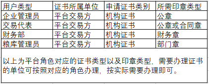 廣州糧食交易綜合服務(wù)平臺各角色對應(yīng)需要的證書如圖所示: