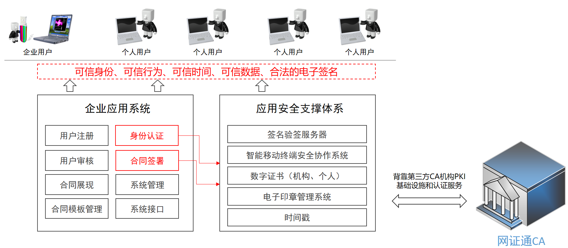 根據電子合同簽訂的應用場景,在企業應用系統所在網絡中部署簽名驗簽服務器、智能移動終端安全協作系統、電子印章管理系統、時間戳服務等設備;通過網絡連接網證通CA中心,網證通CA中心提供可信時間戳服務和電子憑證服務;在應用系統中集成PKI安全中間件;在PC客戶端或移動客戶端安全相應的網證通安全客戶端軟件,再適配相應的數字證書,就完成整個方案的部署。