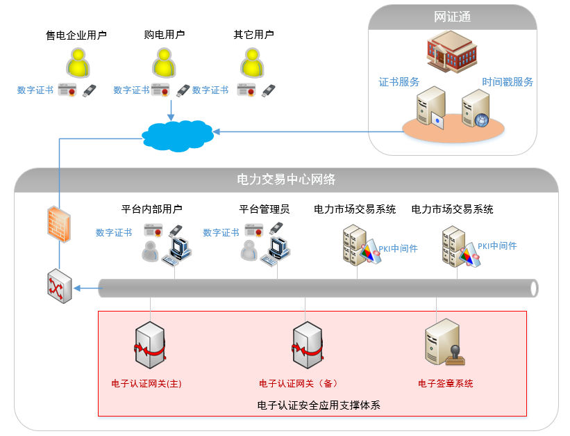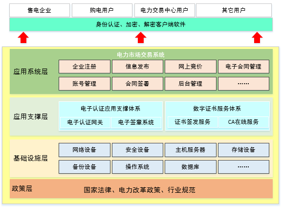 引入合法第三方CA電子認證技術,搭建電子認證支撐平臺,與電力市場交易系統有機結合,解決電力交易的身份認證安全、數據傳輸安全、網上報價保密、網上合同簽署的合法性等安全需求。
